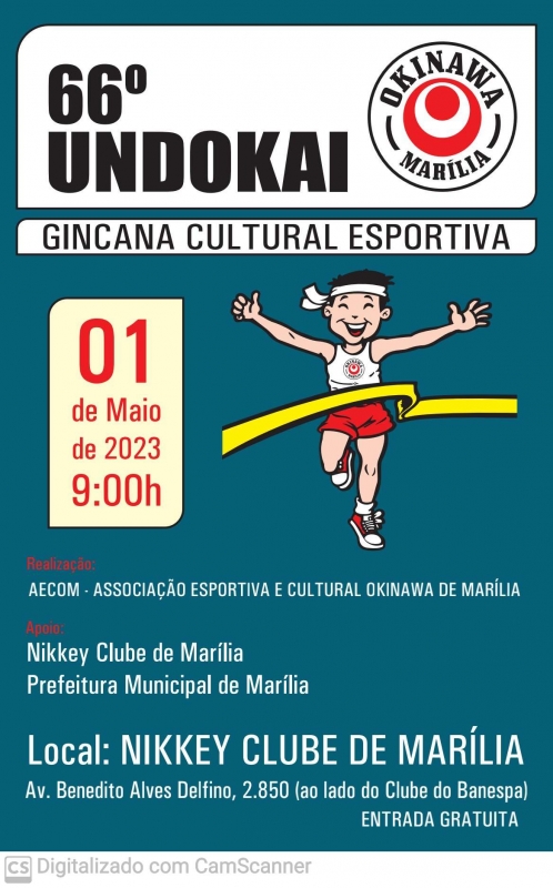 Acontece nesta segunda-feira, 1º de maio, o 66º Undokai. Com entrada gratuita, evento acontece no Nikkey Clube de Marília – sede campestre ((av Benedito Alves Delfino, 2850). O Undokai é uma gincana esportiva e cultural realizada pela AECOM (Associação Esportiva Cultural Okinawa de Marilia) e está inserida no Calendário Municipal.
