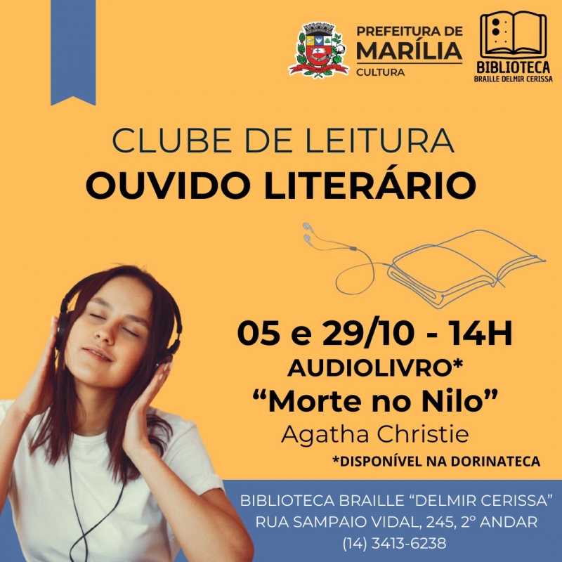 O livro retrata uma aventura a bordo de um barco que navega pelas águas do rio Nilo. É nesse ambiente que uma jovem é encontrada sem vida. Cabe ao detetive Hercule Poirot descobrir qual passageiro foi responsável pelo crime. Para baixar o arquivo em áudio, basta acessar o site da Dorinateca (https://dorinateca.org.br/acervo). A mediação será feita pela bibliotecária Ana Laura, em parceria com a Associação dos Deficientes Visuais de Marília – Adevimari.