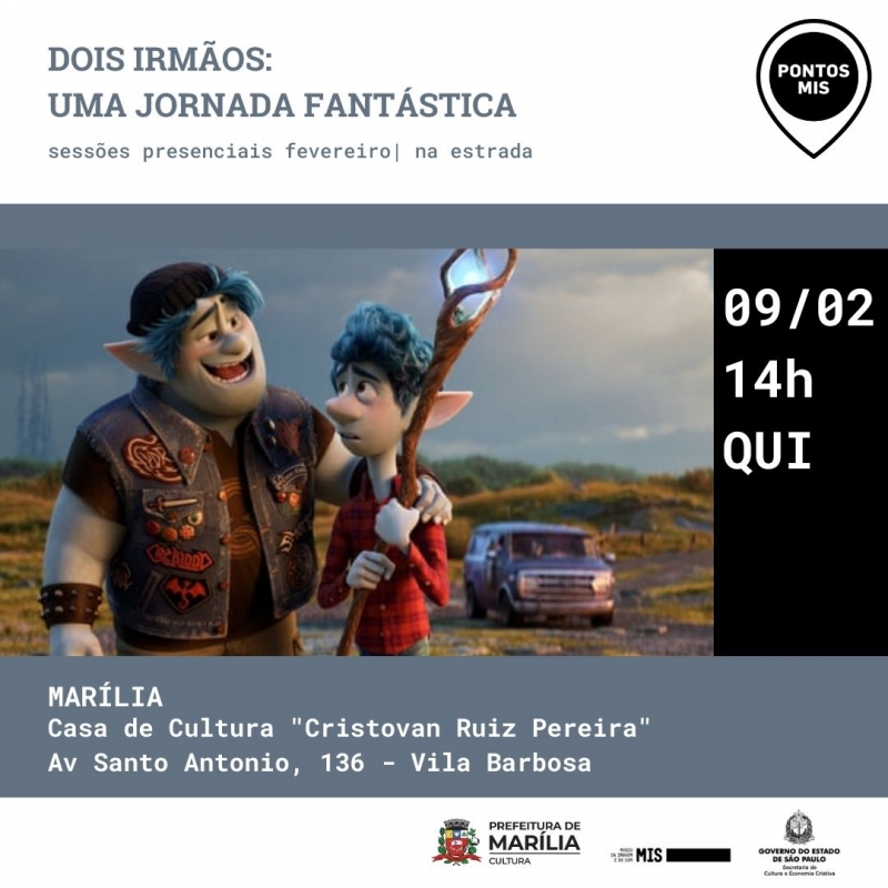 A Casa de Cultura “Cristovan Ruiz Pereira” exibirá no dia 09 de fevereiro, às 14h, a sessão presencial do filme “Dois irmãos: uma jornada fantástica”, animação de 2020. A sessão é realizada pelo Pontos MIS em parceria com a Secretaria da Cultura, e a entrada é gratuita.