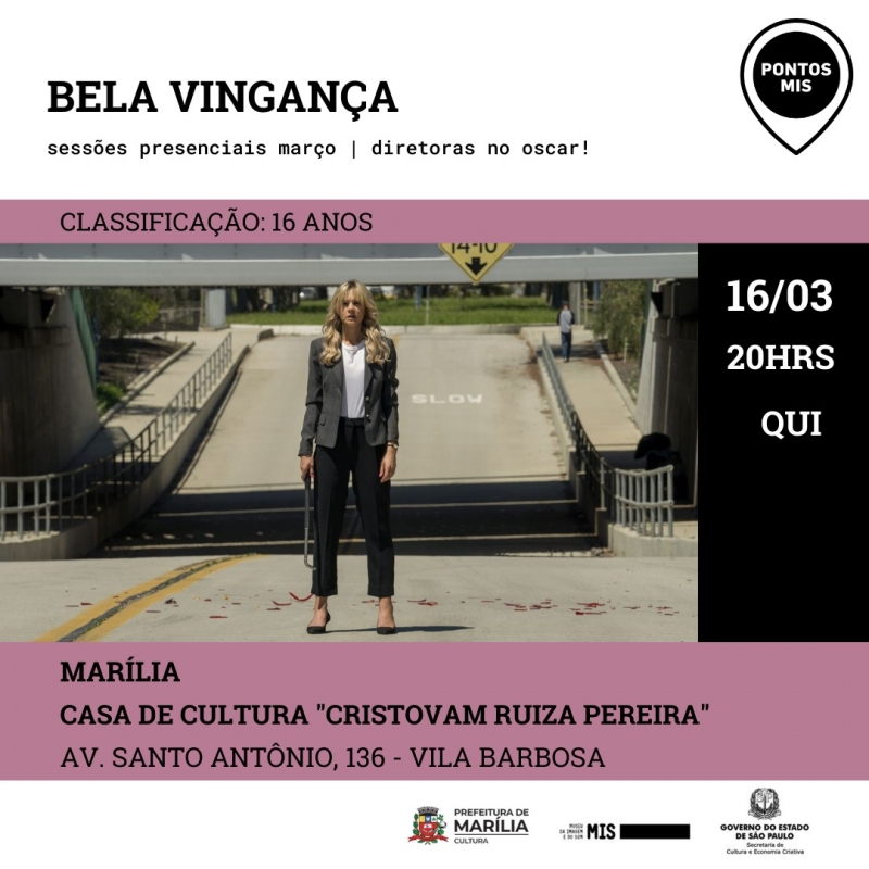 A Casa de Cultura “Cristovan Ruiz Pereira” receberá nesta quinta-feira, dia 16 de março, às 20h, a sessão presencial do filme “Bela Vingança". A entrada é gratuita.