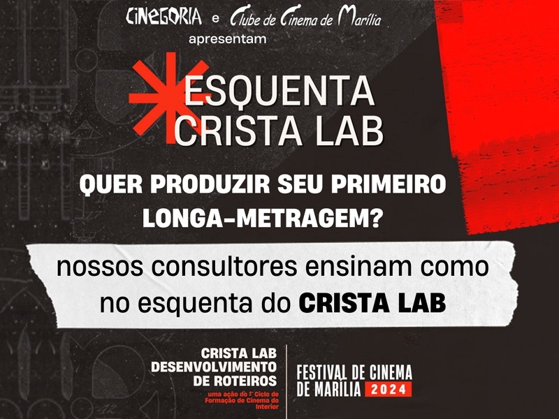 O CristaLab é uma ação do 2º Ciclo de Formação de Cinema do Interior, parte do Festival de Cinema de Marília 2024. Os selecionados para o CristaLab na categoria roteiro para longa de ficção e roteiro para longa documentário irão receber bolsas para se dedicarem aos seus projetos que totalizam R$ 10 mil. Assistentes de roteiro irão receber acesso gratuito ao curso online introdutório.