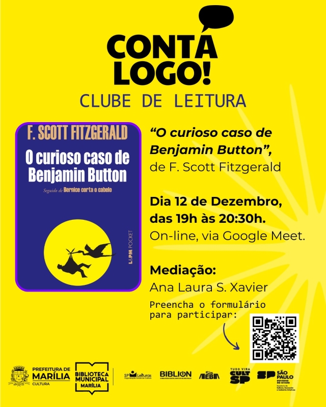Em dezembro, o Clube de Leitura "Conta Logo!" se reúne para conversar sobre O Curioso Caso de Benjamin Button, de F. Scott Fitzgerald. A obra, que inspirou o famoso filme homônimo narra a história peculiar de um homem que nasce idoso e rejuvenesce ao longo dos anos, abordando questões sobre o tempo, as relações humanas e os paradoxos da vida.