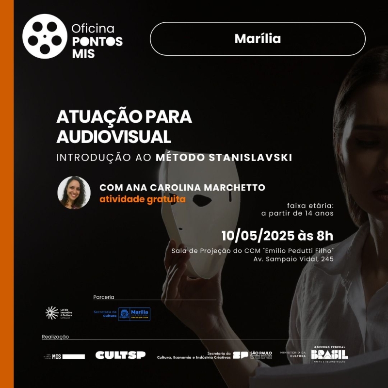 A Secretaria da Cultura está com inscrições abertas para a Oficina gratuita Pontos MIS: “ATUAÇÃO PARA AUDIOVISUAL - INTRODUÇÃO AO MÉTODO STANISLAVSKI”. . A oficina acontecerá dia 10 de maio das 08h às 12h e acontecerá na Sala Municipal de Projeção do CCM “Emílio Pedutti Filho”, que fica no Complexo Cultural Braz Alécio – AV Sampaio Vidal, 245 , piso superior.