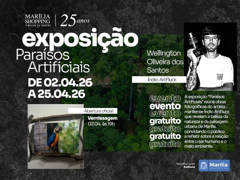 O Marília Shopping recebe, de 2 a 25 de abril, a exposição “Paraísos Artificiais”, uma coletânea de obras fotográficas do artista visual mariliense Wellington Oliveira dos Santos, conhecido como Índio ArtFluor. Com entrada gratuita, a mostra, promovida em parceria com a Prefeitura de Marília, por meio da Secretaria Municipal da Cultura, promete proporcionar ao público uma experiência estética e reflexiva por meio da arte.