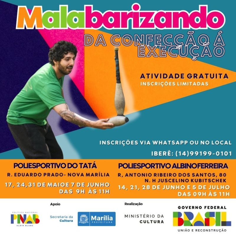 A Secretaria da Cultura de Marília divulgou nesta semana a abertura das inscrições gratuitas para a Oficinas Malabarizando – da Confecção á Execução, com Iberê. As Oficinas são indicadas para todas as idades, partindo desde a confecção dos instrumentos de malabares artesanais até aula prática de técnicas e truques com bolinhas.