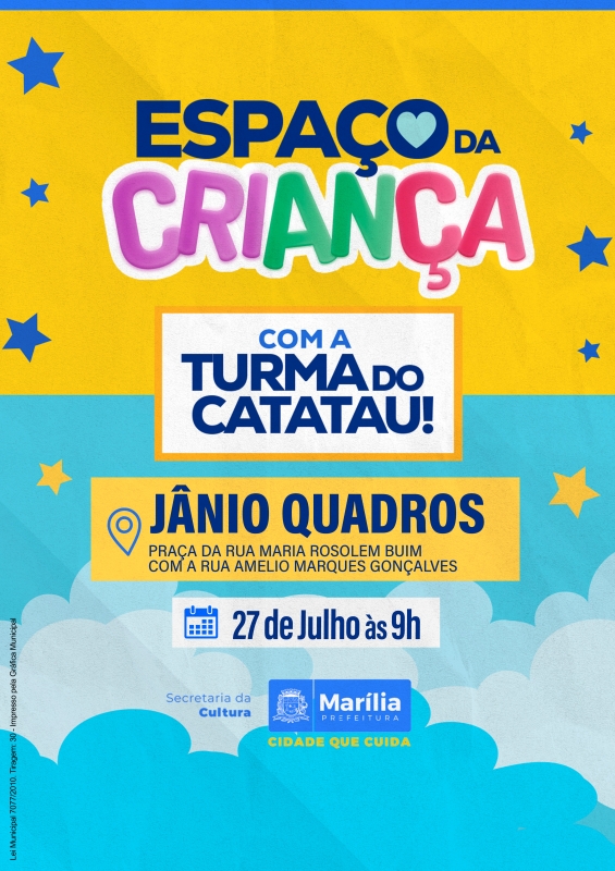 A Prefeitura de Marília, por meio da Secretaria Municipal da Cultura, realizará neste domingo, dia 27 de julho, das 9h às 12h, o evento Espaço da Criança com Turma do Catatau, levando muita brincadeira, cultura e diversão para a criançada.O Espaço acontecerá na Praça da Rua Maria Rosolem Buim com a Rua Amelio Marques Gonçalves – no Bairro Jânio Quadros. O evento é itinerante, percorrerá todas as regiões da cidade e acontecerá uma vez ao mês.