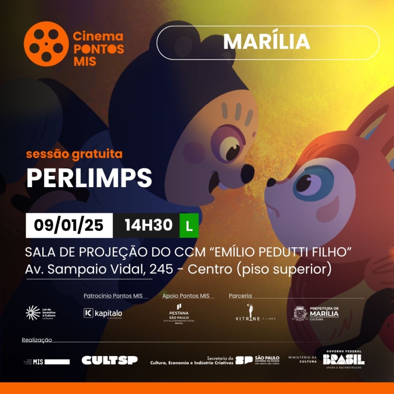 A Secretaria da Cultura em parceria com o Projeto Pontos MIS do Museu da Imagem e do Som de SP exibe hoje, às 14h30 na Sala de Projeção do CCM o Filme "Perlimps", com entrada gratuita. Traga seus filhos e venha assistir uma animação super divertida!