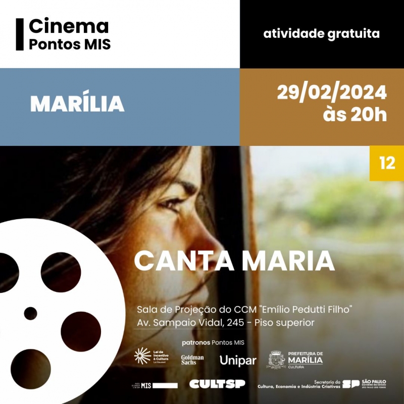 A Secretaria Municipal de Cultura de Marília, em parceria com o Museu da Imagem e do Som, através do Pontos MIS, exibe nesta quinta-feira, dia 29 de fevereiro, às 20 horas, o filme “Canta Maria”, filme nacional, que tem no elenco os artistas José Wilker, Marco Ricca, Vanessa Giácomo, entre outros.
