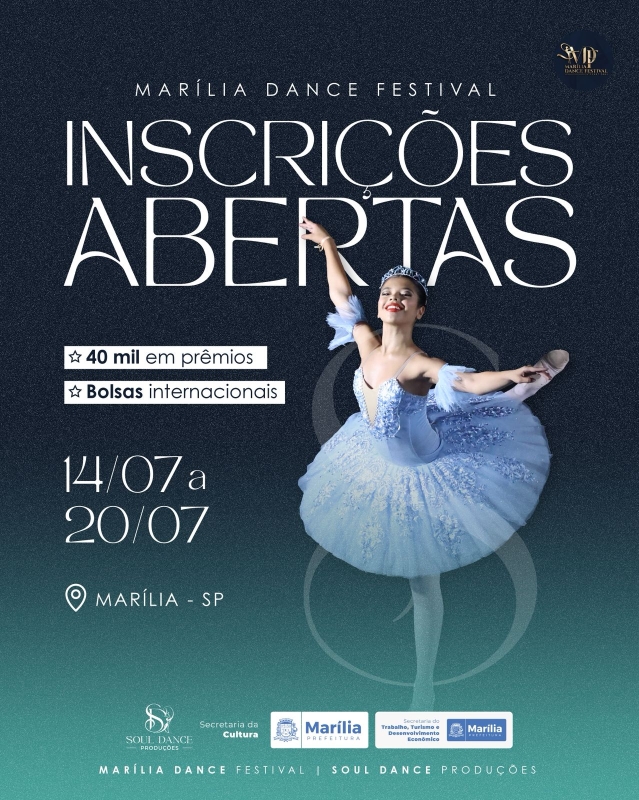 A cidade de Marília receberá de 14 a 20 de julho o Marília Dance Festival, uma parceria entre Prefeitura de Marília – por meio das Secretarias da Cultura e Trabalho, Turismo e Desenvolvimento Econômico, e a Soul Dance Produções. Evento de caráter internacional, será realizado anualmente, sendo oferecido neste ano a premiação de R$40 mil em dinheiro e bolsas internacionais para os vencedores.
