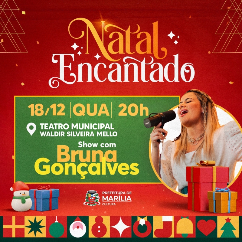 Teatro Municipal recebe show gratuito de Bruna Gonçalves na próxima quarta-feira, 18. Show realizado pela Secretaria da Cultura e Acim, integra programação do Natal Encantado.