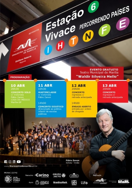Nos dias 12 e 13 de abril de 2024, a ORQUESTRA FILARMÔNICA DE MARÍLIA, apresentará os CONCERTOS do Projeto "ESTAÇÃO VIVACE - EM CADA PARADA UMA EXPERIÊNCIA MUSICAL" - Pronac 223742. A ORQUESTRA contará com a do grande instrumentista, FÁBIO ZANON.