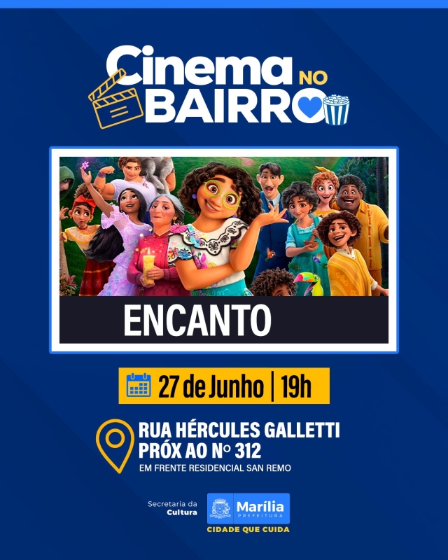 A Prefeitura de Marília, por meio da Secretaria da Cultura, realizará nesta sexta-feira, 27 de junho, mais uma edição do programa Cinema no Bairro. Evento totalmente gratuito, acontecerá na Rua Hércules Galletti, próximo ao número 312 (Em frente ao residencial San Remo).