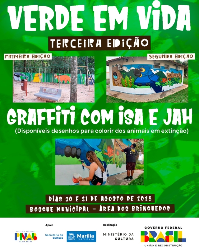 Nos dias 30 e 31 de Agosto, o Bosque Municipal de Marilia recebe uma iniciativa que une arte urbana, educação e preservação ambiental. É o Verde em Vida, projeto idealizado pelos produtores culturais Jah e Isa e realizado com apoio da Prefeitura de Marília. A edição é viabilizada por meio de recurso da PNAB – Política Nacional Aldir Blanc, por meio do edital de chamamento público nº 06/2024 da Secretaria Municipal de Cultura, voltado ao fomento de ações culturais no município.