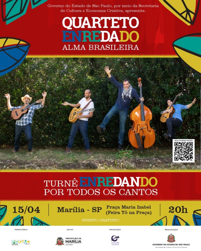 O grupo francano de música instrumental brasileira Quarteto Enredado - reconhecido pela sua característica ousada de mesclar a música caipira, a erudita, a MPB, o jazz e o rock - estreia em Marília (SP) a turnê “Enredando por todos os cantos” que comemora o lançamento do primeiro álbum da carreira “Alma Brasileira”. O evento será realizado com apoio da Secretaria da Cultura de Marília.