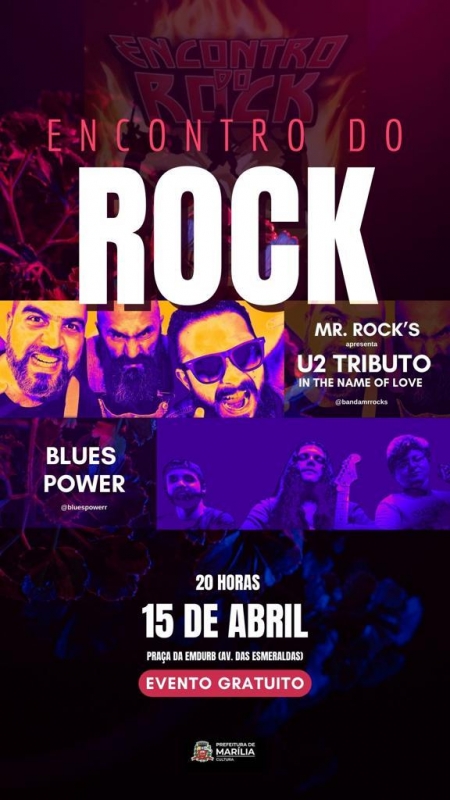 Acontece neste sábado, 15 de abril, a partir das 20h, mais uma edição do Encontro do Rock. O evento é gratuito e acontecerá na Praça da Emdurb – Av das Esmeraldas. A programação contará com as Bandas Blues Power e Mr. Rocks.