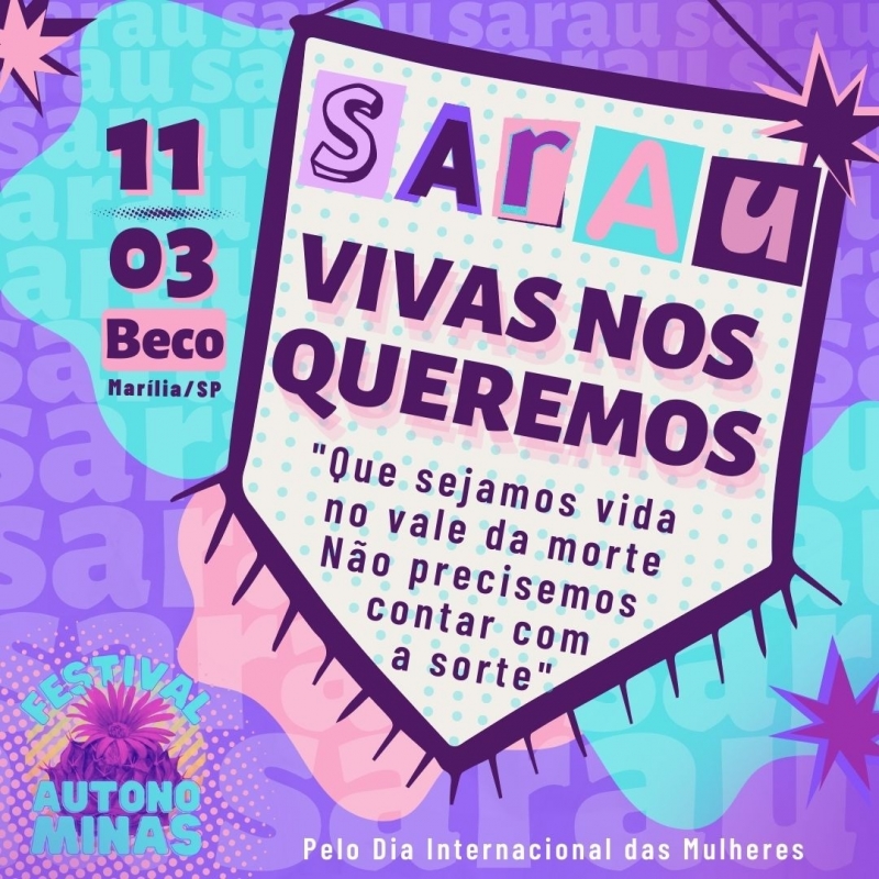 Pelo Dia Internacional das Mulheres, o Festival AutonoMinas apresenta o Sarau Viva Nos Queremos, para homenagear mulheres marilienses vivas registrando a liberdade e a arte das ilustres artistas locais. O Sarau acontecerá no dia 11 de março no Beco Resistência - Av, Ipiranga, 271, das 18h às 23h.