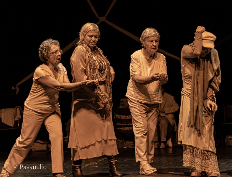 Sinopse: Ancestralidade, referências de ontem, hoje e de um amanhã. No processo desenvolvido para esse espetáculo, apanhando memórias, relicários e lembranças ainda vivas nos artistas, atores e atrizes, que se reencontram com suas origens, memórias e emoções. A presença e força feminina, a mulher e seu domínio em conjuntura com a essência de nosso planeta, a grande mãe terra, a natureza e sua magnitude geradora de vida .Úteros férteis promovendo a vida em contraponto a existência permanente da morte. Da fé, das benzedeiras e de toda mãe que sabe apaziguar dores e receitas naturais de como curar feridas do corpo e da alma. Um espetáculo concebido de narrativas, e colaborado das emoções do grupo, traz consigo o profundo desejo em tocar o público com verdades e simbolismo. Uma tentativa poética e artística de revelar o Espelho do tempo.