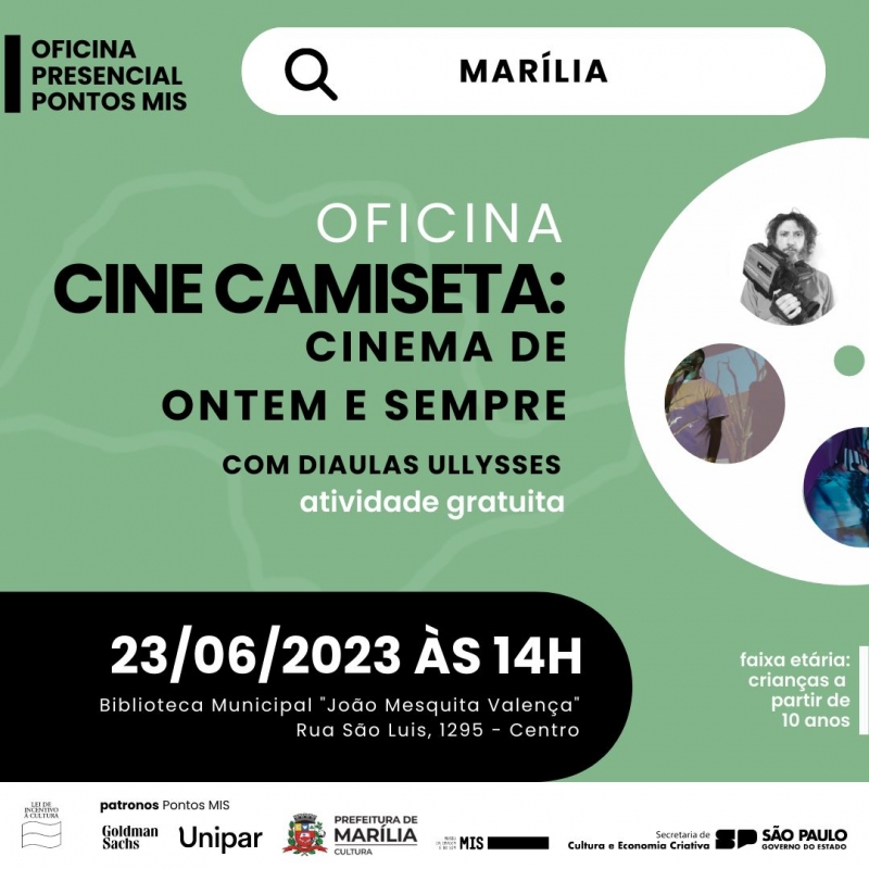 A Secretaria da Cultura de Marília realizará na sexta-feira, 23 de junho, às 14h, a oficina presencial para crianças (acima de 10 anos) e adultos “Cine Camiseta - Cinema de Ontem e Sempre”, com Diaulas Ullysses. A participação é gratuita.