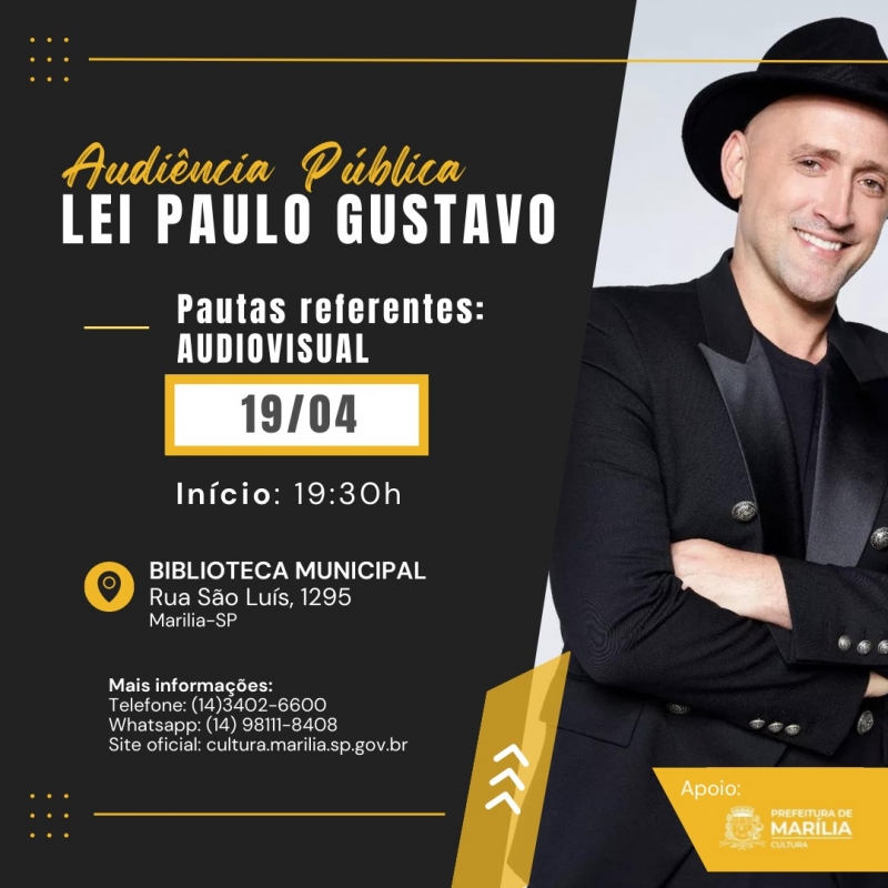 A Prefeitura de Marília, por meio da Secretaria Municipal da Cultura, em parceria com o Conselho Municipal da Cultura e o GT Paulo Gustavo realizará o segundo encontro com os produtores culturais do setor audiovisual da cidade.A reunião será na quarta-feira, dia 19 de abril, às 19h30 na sede da Biblioteca Municipal, localizada na Rua São Luiz, 1245, piso térreo (entrada pela Rua São Carlos).