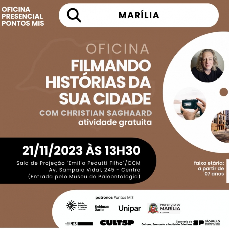 A Secretaria da Cultura está com inscrições abertas para a Oficina gratuita Pontos MIS: Filmando Histórias da sua Cidade, que acontecerá dia 21 de novembro, das 13h30 às 17h30, na Sala de Projeção "Emilio Pedutti Filho"/CCM - Av. Sampaio Vidal 245, piso superior.