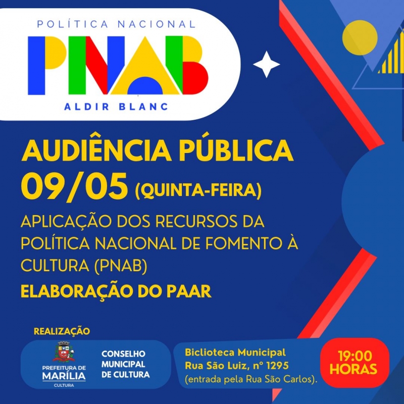 A Prefeitura Municipal de Marília, por meio da Secretaria Municipal da Cultura e Conselho Municipal de Política Cultural realizam nesta quinta-feira, dia 9 de maio de 2024, audiência pública para a elaboração do Plano Anual de Aplicação de Recursos (PAAR) da Polícia Nacional Aldir Blanc de Fomento à Cultura (PNAB). O encontro está marcado para acontecer a partir das 19h, na Biblioteca Municipal ‘João Mesquita Valença’, na rua São Luiz, nº 1295 (entrada pela rua São Carlos).