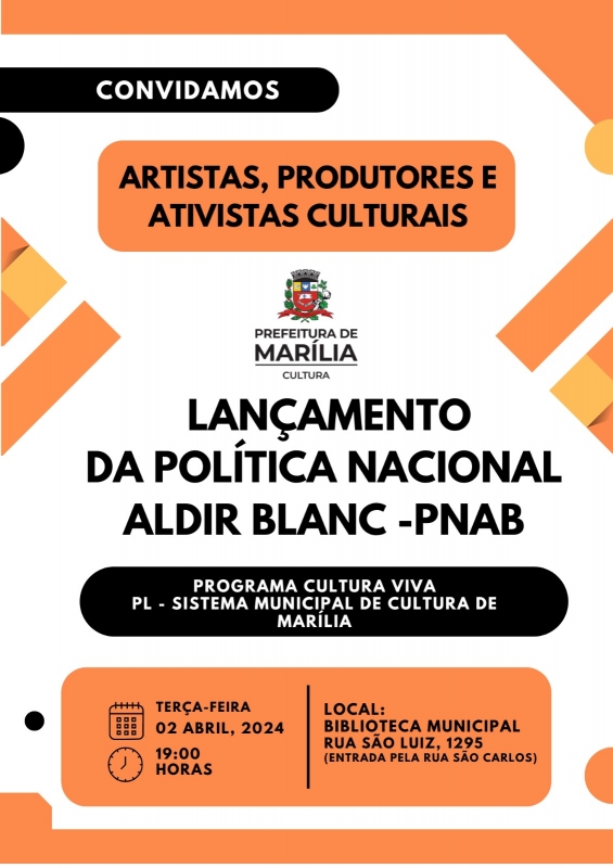 A Prefeitura Municipal de Marília, por meio da Secretaria da Cultura e Conselho de Política Cultural realizará encontro com artistas, produtores, agentes e ativistas culturais, para o lançamento da Política Nacional Aldir Blanc de Fomento à Cultura (PNAB), instituída pela Lei Federal nº 14.399/2022.O encontro será realizado na próxima terça-feira (02) de abril, às 19h na Biblioteca Municipal, localizada na Rua São Luiz, nº 1295.