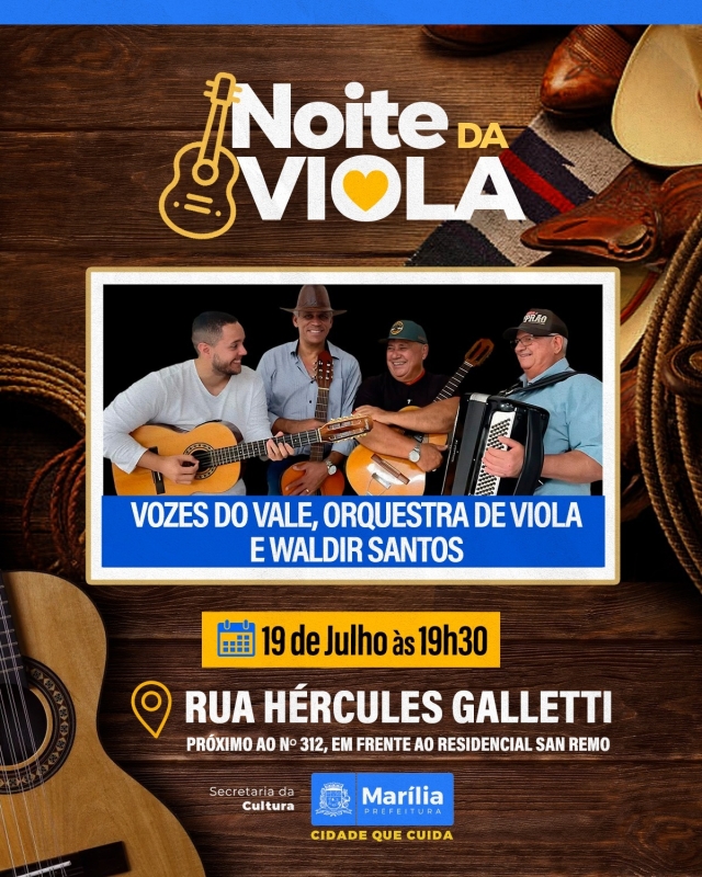 A Prefeitura de Marília, por meio da Secretaria Municipal da Cultura, realizará neste sábado, 19 de Julho, mais uma edição do evento Noite da Viola, que acontecerá na rua Hércules Galletti, próximo ao nº 312, em frente ao Residencial San Remo – zona Oeste.O evento é gratuito e acontece mensalmente pelos bairros da cidade, prometendo relembrar músicas clássicas do sertanejo raiz e valorizar a cultura sertaneja brasileira.