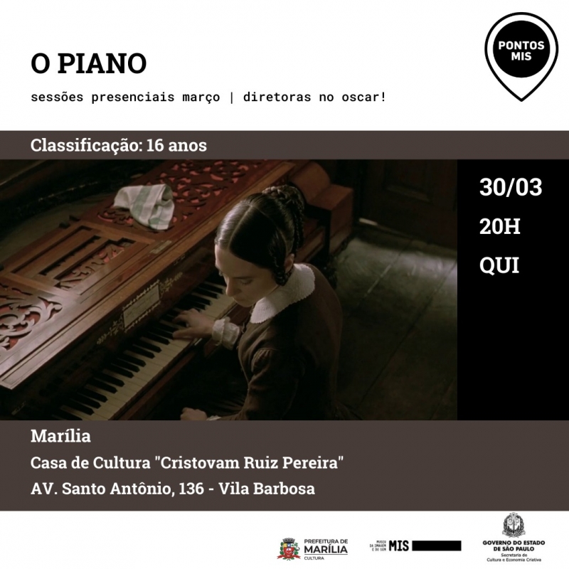 A Casa de Cultura “Cristovan Ruiz Pereira” receberá nesta quinta-feira, dia 30 de março, às 20h, a sessão presencial do filme “O Piano". A entrada é gratuita.