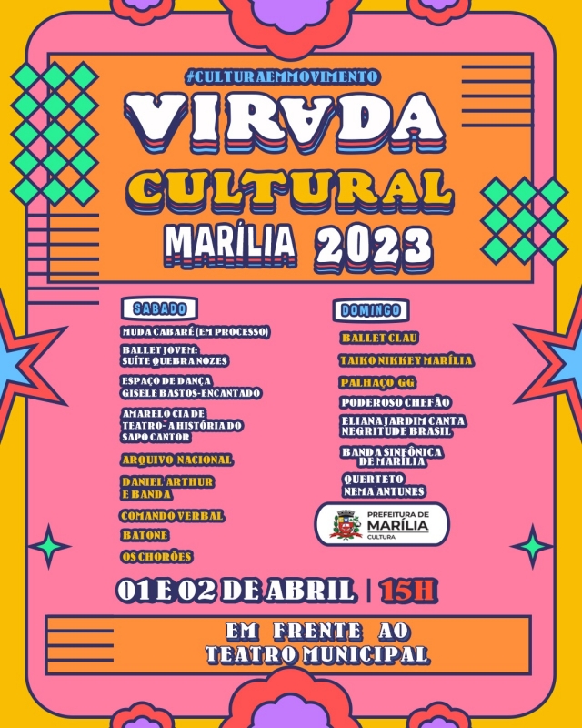 A Prefeitura de Marília, por meio da Secretaria Municipal da Cultura, realizará nos dias 1º e 2 de abril a Virada Cultural Marília 2023. Totalmente gratuito, o evento acontecerá na praça em frente ao Teatro Municipal.O evento integra a programação especial de aniversário de Marília (4 de abril).