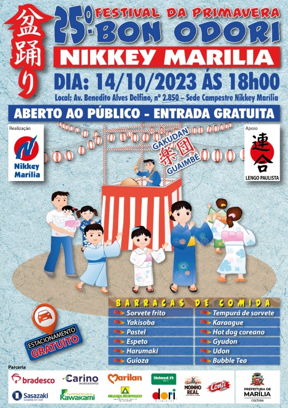 O Nikkey de Marília, com apoio da Prefeitura de Marília, por meio da Secretaria Municipal da Cultura, realizará no próximo sábado -14 de outubro, a partir das 18h, o Festival da Primavera “Bon Odori”, que está completando 25 anos.