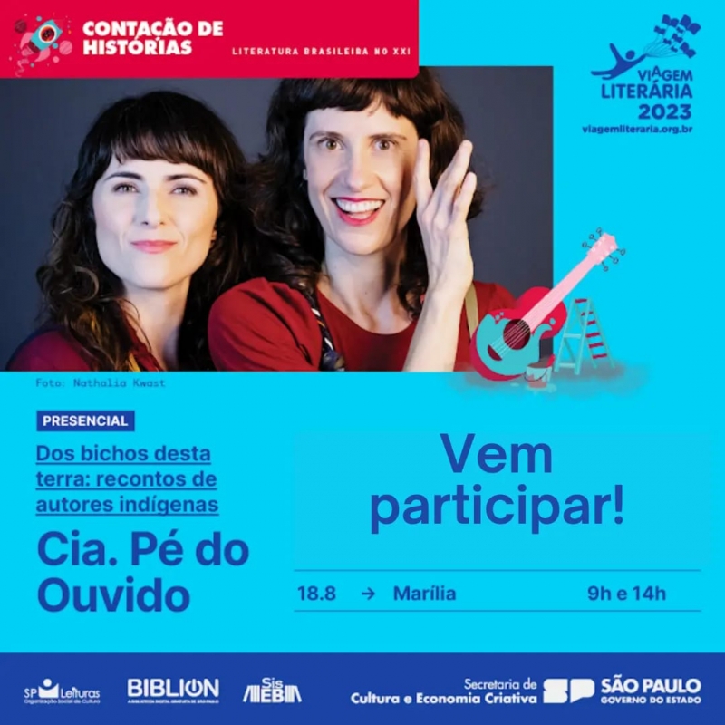 Quem se apresentará é a Cia. Pé do Ouvido, criada em 2013 por Débora Sperl e Lilia Nemes, compartilhando contos de tradição oral e narrativas literárias. Contará a história “Dos bichos desta terra: recontos de autores indígenas”, inspirada na coleção “Histórias à brasileira” (Editora Cia. das Letrinhas), que a Biblioteca já disponibiliza para empréstimo e leitura.