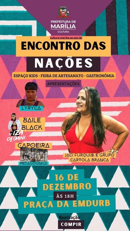 O COMPIR, Conselho Municipal de Promoção da Igualdade Racial, com apoio da Secretaria da Cultura, realizará dia 16 de dezembro, o evento “Encontro das Nações”, na Praça da Emdurb – Av das Esmeraldas, à partir das 18h.