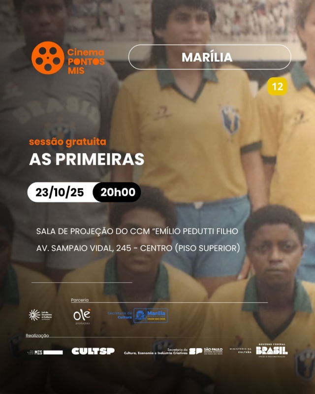 A Secretaria da Cultura de Marília e o Museu da Imagem e do Som, por meio do Programa Pontos MIS, apresentam nesta quinta-feira, 23/10, 20h, sessão especial de cinema, com exibição do filme “As Primeiras”, documentário que retrata a vida de um grupo de mulheres que vivem nos subúrbios do Rio de Janeiro, com aproximadamente 60 anos e guardam um passado comum: são a base da primeira seleção feminina de futebol do Brasil.