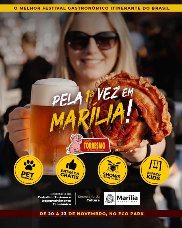O Festival do Torresmo, que conta com apoio da Secretaria da Cultura de Marília, será realizado no espaço Eco Park da cidade, ao lado do Bosque Municipal. O evento tem entrada gratuita e oferece atrações para toda a família.