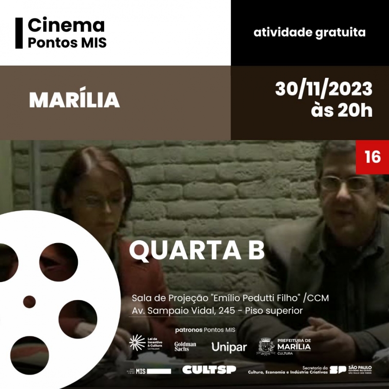 A Secretaria Municipal de Cultura de Marília, em parceria com o Museu da Imagem e do Som, através do Pontos MIS, exibe nesta quinta-feira, dia 30 de novembro, às 20 horas, o filme “Quarta B”.