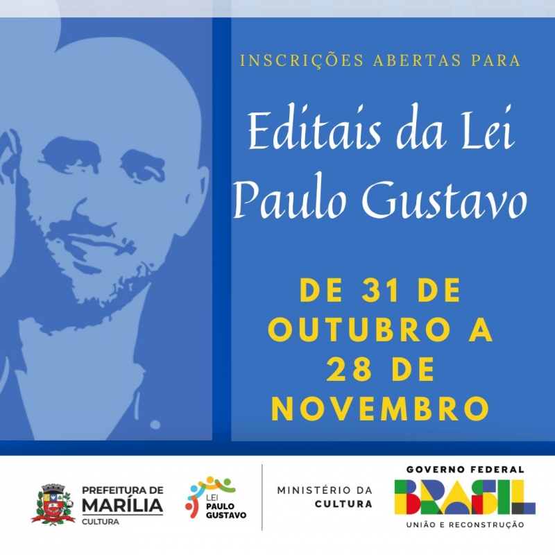 A Prefeitura Municipal de Marília e Secretaria Municipal da Cultura de Marília abrem nesta terça-feira, dia 31 de outubro de 2023, o período de inscrições para projetos culturais de diversas áreas culturais da Lei Paulo Gustavo. Os interessados - pessoas físicas ou pessoas jurídicas - residentes em Marília poderão se inscrever até as 17 horas do próximo dia 28 de novembro de 2023 e o inteiro teor do ato convocatório e anexos estão à disposição para consultas, no portal www.marilia.sp.gov.br/licitacao.