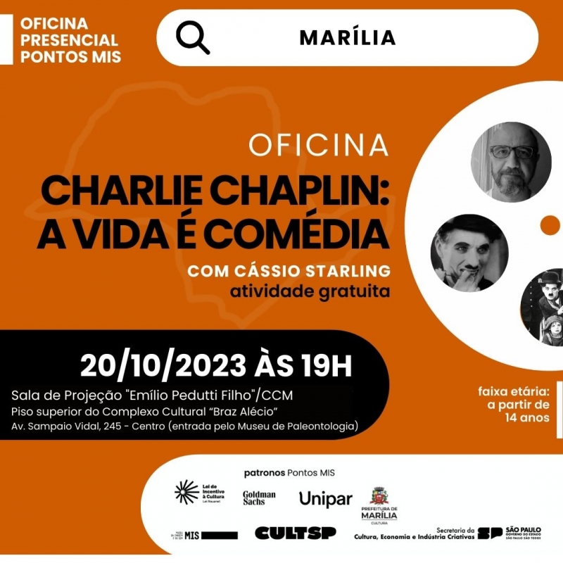 A Secretaria da Cultura está com inscrições abertas para a Oficina de Audiovisual Charlie Chaplin - A vida é comédia”, que acontecerá dia 20 de outubro, das 19h às 22h, na Sala de Projeção "Emilio Pedutti Filho"/CCM - Av. Sampaio Vidal 245, piso superior.